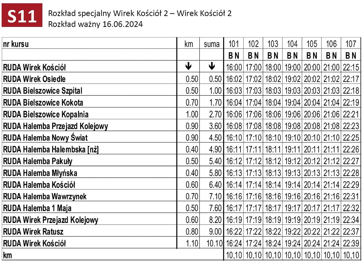 Linia S11 kursować będzie po trasie: Wirek Kościół - Wirek Osiedle - Bielszowice Szpital - Bielszowice Kokota - Bielszowice Kopalnia - Halemba Przejazd Kolejowy - Halemba Nowy Świat - Halemba Halembska [nż] - Halemba Pakuły - Halemba Młyńska - Halemba Kościół - Halemba Wawrzynek - Halemba 1 Maja - Wirek Przejazd Kolejowy - Wirek Ratusz - Wirek Kościół.