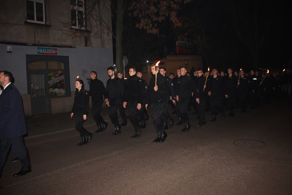 Po zakończonym ślubowaniu uczniowie wraz z rodzicami oraz mieszkańcami pobliskich ulic, którzy tłumnie przybyli na uroczystość, przeszli w asyście orkiesty dętej pod Pomnik Obrońców Ojczyzny przy ul. kard. Hlonda. Pod pomnikiem dyrekcja szkoły, przedstawiciele władz miasta oraz służb mundurowych złożyli kwiaty.