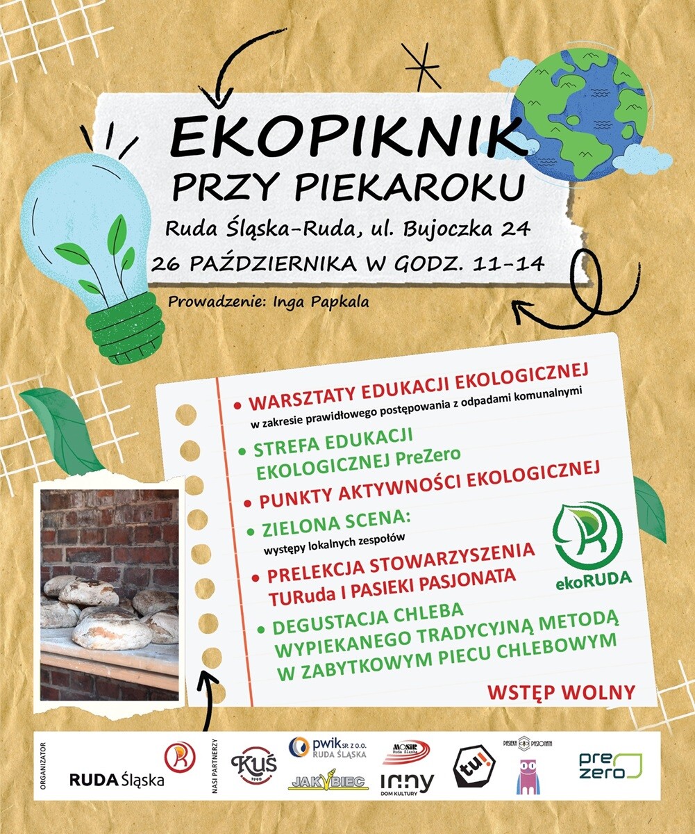 Już w najbliższą sobotę /26 października br./ będzie ostatnia w tym roku okazja do degustacji chleba z piekaroka. O godz. 11:00 przy jedynym czynnym w regionie zabytkowym piecu chlebowym (ul. Bujoczka 24 w dzielnicy Ruda) rozpocznie się ekopiknik z szeregiem występów artystycznych, warsztatów, stoisk i prelekcji dotyczących zasad prawidłowej segregacji odpadów. Imprezę poprowadzi Inga Papkala.