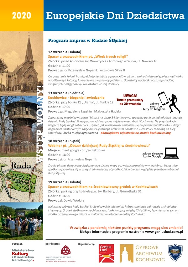 W programie rudzkiej edycji wydarzenia zaplanowano spacery po ciekawych miejscach, m.in. średniowiecznym gródku w Kochłowicach oraz webinar pt. „Obszar dzisiejszej Rudy Śląskiej w średniowieczu”. Udział w imprezach jest bezpłatny, ale organizatorzy zaznaczają, że w związku z pandemią niektóre punkty programu mogą ulec zmianie. Więcej na ten temat na stronie www.geniusloci.com.pl