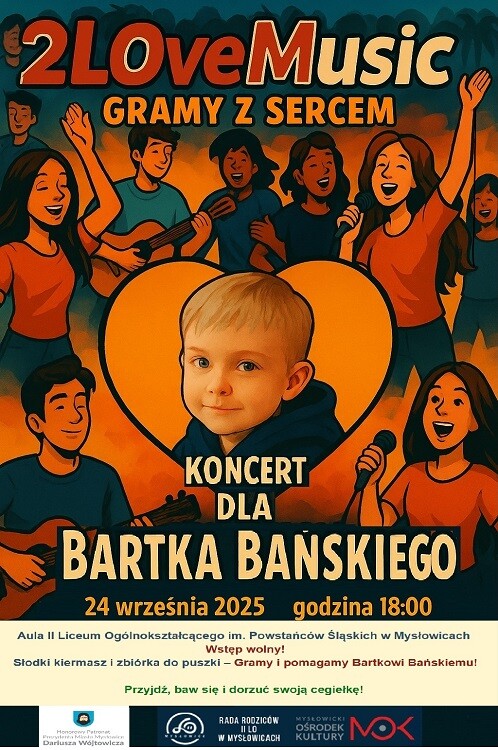 Już 24 września w Auli II Liceum Ogólnokształcącego w Mysłowicach odbędzie się wyjątkowy koncert charytatywny – „Gramy z sercem – dla Bartka!”. Wydarzenie to jest częścią akcji wspierającej Bartka Bańskiego, a dochód z koncertu oraz zbiórki zostanie przeznaczony na pomoc dla niego.