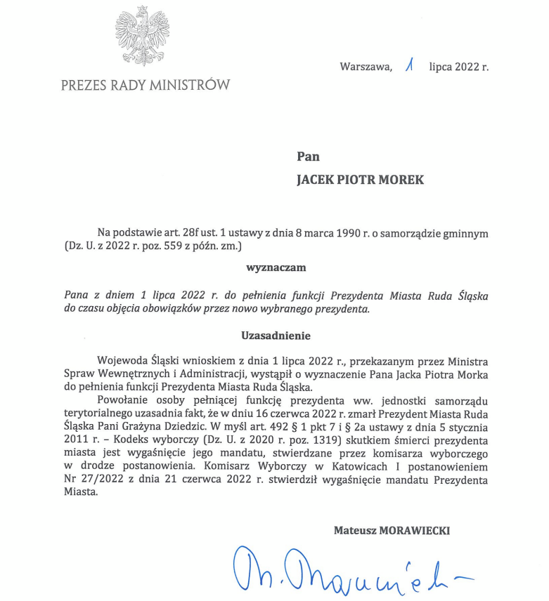 Jacek Morek jako komisarz miasta będzie pełnił obowiązki prezydenta Rudy Śląskiej do momentu przeprowadzenia przedterminowych wyborów. Ich datę wstępnie wyznaczono na 11 września.