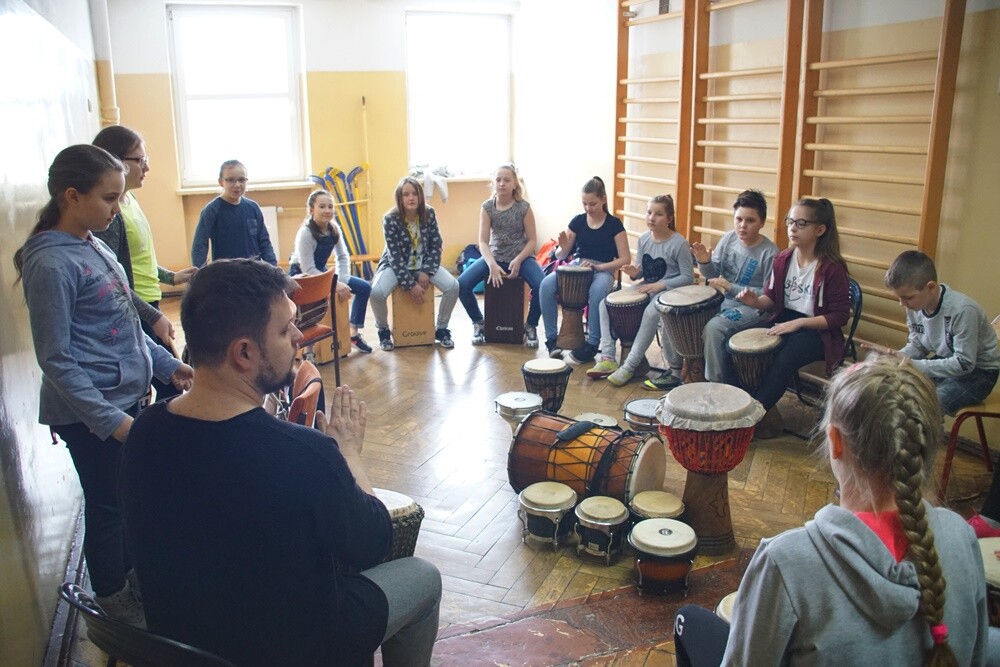 - Pomysł wziął się stąd, że gram na bębnach, lubię to robić i chcę się tą pasją dzielić z dzieciakami. Przy okazji jest to pomysł na kreatywne spędzenie wolnego czasu i rozładowanie energii – mówił Andrzej Żydek. – Spotykamy się w każdy poniedziałek w szkole i gramy. Najbardziej wyjątkowe dla mnie było to, że dzieci już po pierwszych zajęciach myślały o kolejnych. Jest to dla nich coś innego, nowego. Na zajęciach nigdy nie jest nudno, gramy i śpiewamy. Ostatnio wprowadziliśmy nawet nowe bębny. Poziom trudności gry również dostosowujemy do możliwości grupy, żby była to dla dzieci przyjemność, a nie obowiązek – dodał.