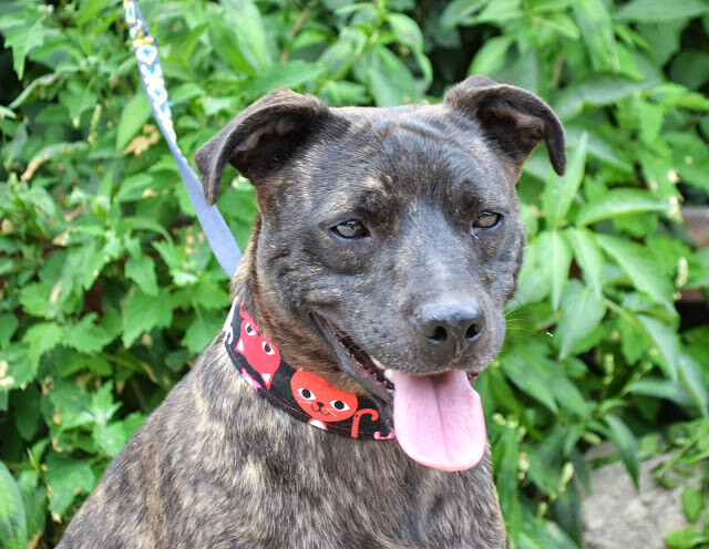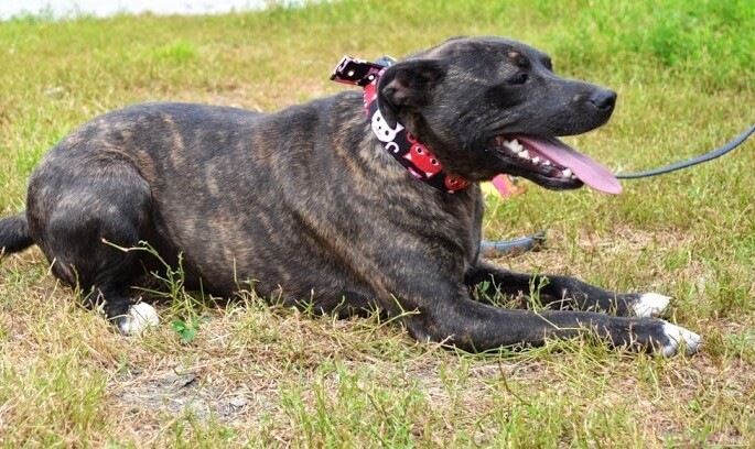 Kenzo jest średnim ok. 2,5 letnim psiakiem. Przypomina nieco mieszańca amstaffa z pięknym pręgowanym umaszczeniem.