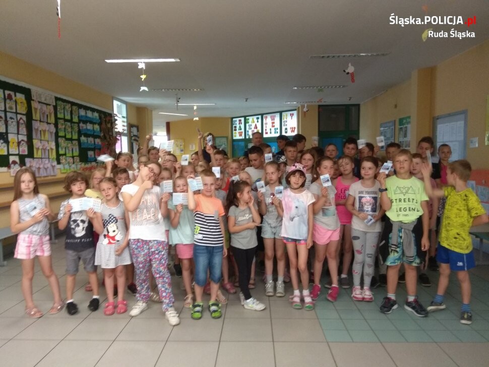 Rudzcy dzielnicowi odwiedzili dzieci, które uczestniczą w półkoloniach zorganizowanych przez Szkołę Podstawową nr 30 w Rudzie Śląskiej.