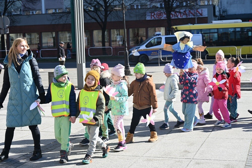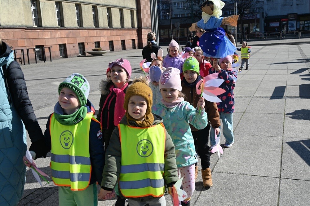 Mali rudzianie z przedszkoli przywitali dzisiaj wiosnę na nowobytomskim rynku. Dzieci przygotowały papierowe kwiaty, które rozdawały mieszkańcom Rudy Śląskiej. Przemaszerowały wraz z opiekunami w kolorowym pochodzie, głośno nawołując wiosnę.