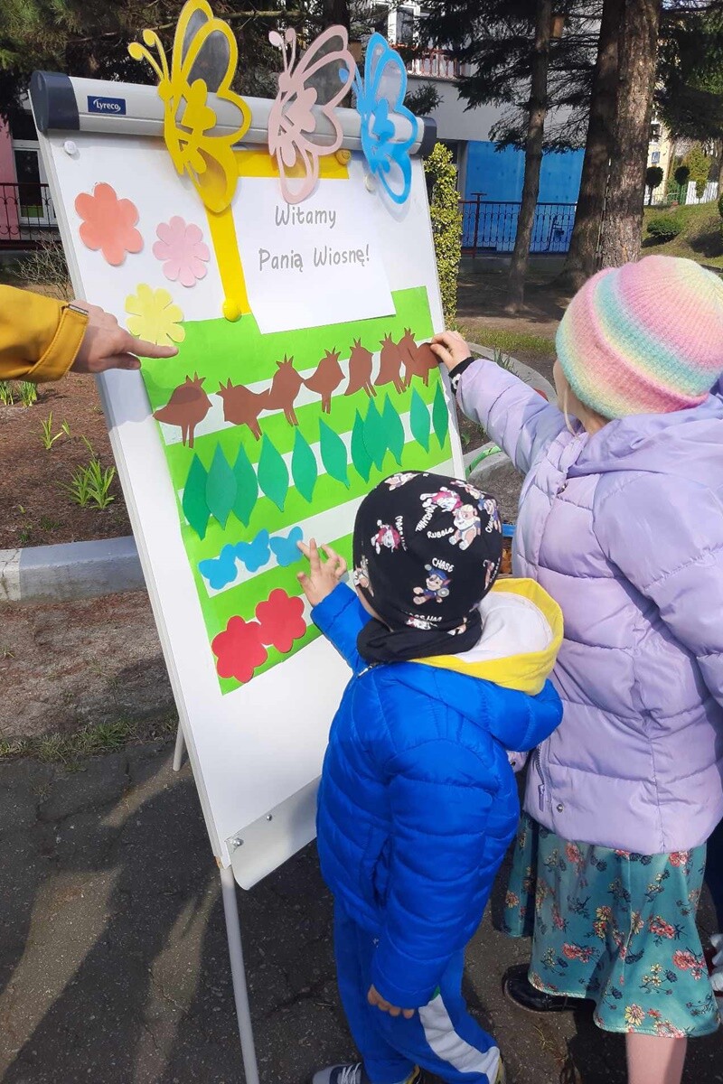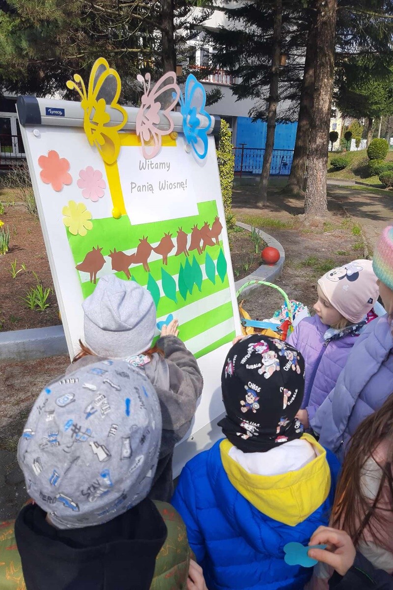 23 marca wychowankowie przedszkola powitali długo wyczekiwaną wiosnę. Dzieci przygotowywały się do Dnia Ziemi, uczestnicząc w zajęciach i pogadankach. Poznały charakterystyczne cechy wiosny, tradycyjne obrzędy pożegnania zimy i powitania nadchodzącej pory roku oraz przygotowały rekwizyty: marzannę i gaiki. W trakcie przemarszu wokół placówki uczestnicy śpiewali piosenki i przywoływali wiosnę, machając pięknymi gaikami. Kolorowy pochód zakończył się symbolicznym zatopieniem kukły Marzanny.