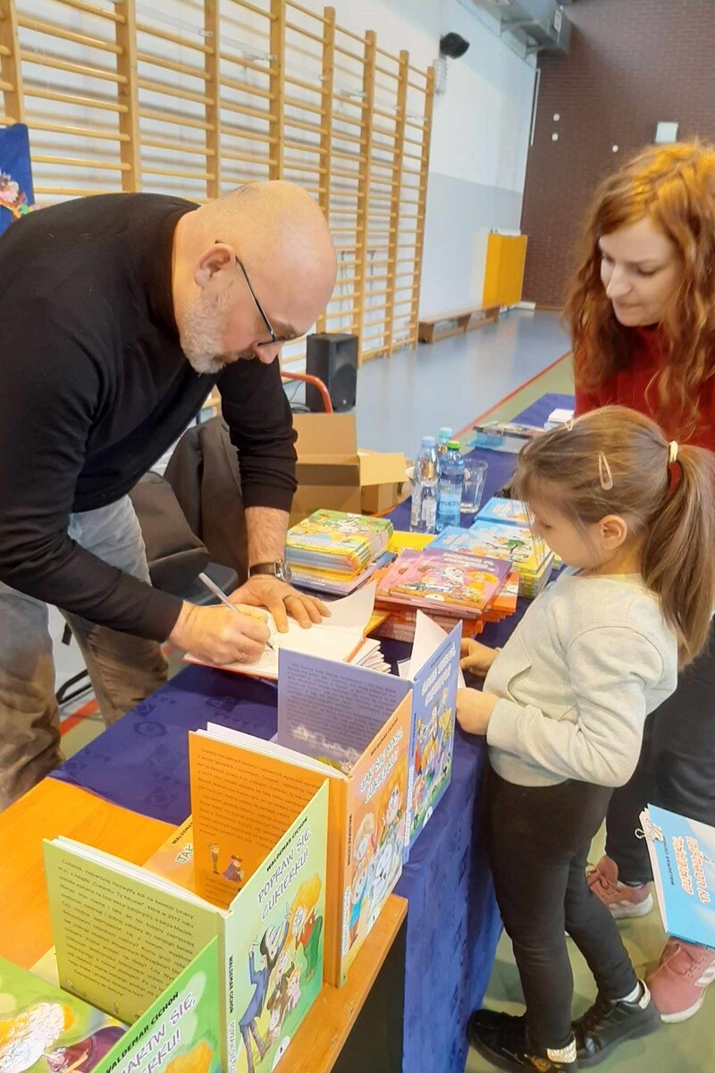 Na początku marca dzieci z najstarszych grup odwiedziły pobliską Szkołę Podstawową nr 21 w Rudzie Śląskiej, gdzie spotkały się z panem Waldemarem Cichoniem, autorem lektury szkolnej pt. „Cukierku, Ty Łobuzie”. Dla wielu z nich było to pierwsze spotkanie z pisarzem. Przedszkolaki miały możliwość bliżej zapoznać się z tą profesją, zapytać skąd czerpie inspiracje i jak powstają książki. Udało się również dostać autografy od pana Waldemara Cichonia.