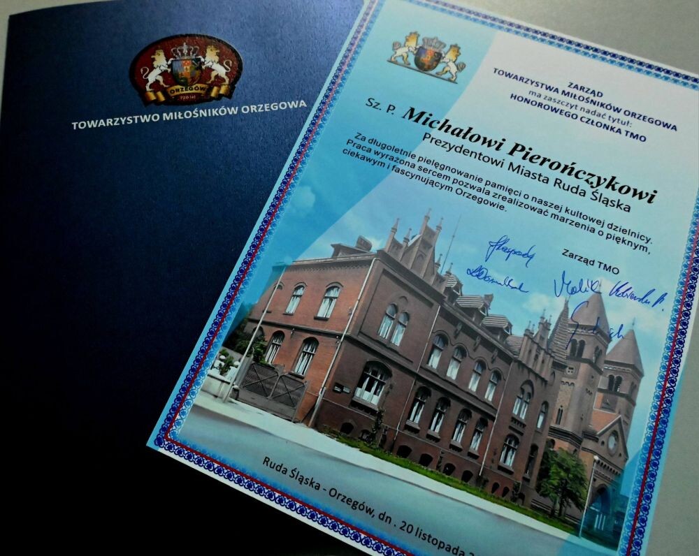 - Tytuł Honorowego Członka Towarzystwo Miłośników Orzegowa to dla mnie wyjątkowe i niezwykle ważne wyróżnienie. Od wielu lat w Orzegowie dzieje się naprawdę dużo. Udało się zrewitalizować wiele miejsc, m.in. Centrum Inicjatyw Społecznych "Stary Orzegów" MBP oraz obiekt sportowy Burloch Arena im. G. Dziedzic, placu doktora Czapli czyli terenów po koksowni. To wszystko nie byłoby możliwe bez ogromnego zaangażowania mieszkańców, w tym nieustającej inspiracji członków Towarzystwa Miłośników Orzegowa. Przed nami kolejne zadania, tym razem zielona rewitalizacja skwerów i renaturyzacja rzeki Bytomki, która stworzy zielony szlak komunikacyjny. Podczas 18-letniej działalności nieoceniony jest wkład Towarzystwa w odkrywanie, zachowanie i popularyzowanie historii oraz dziedzictwa tej części miasta, a także dbałość o zabytki, w tym stary orzegowski cmentarz. Cieszę się, że od wielu lat mogę uczestniczyć w tych działaniach. – czytamy w mediach społecznościowych prezydenta.