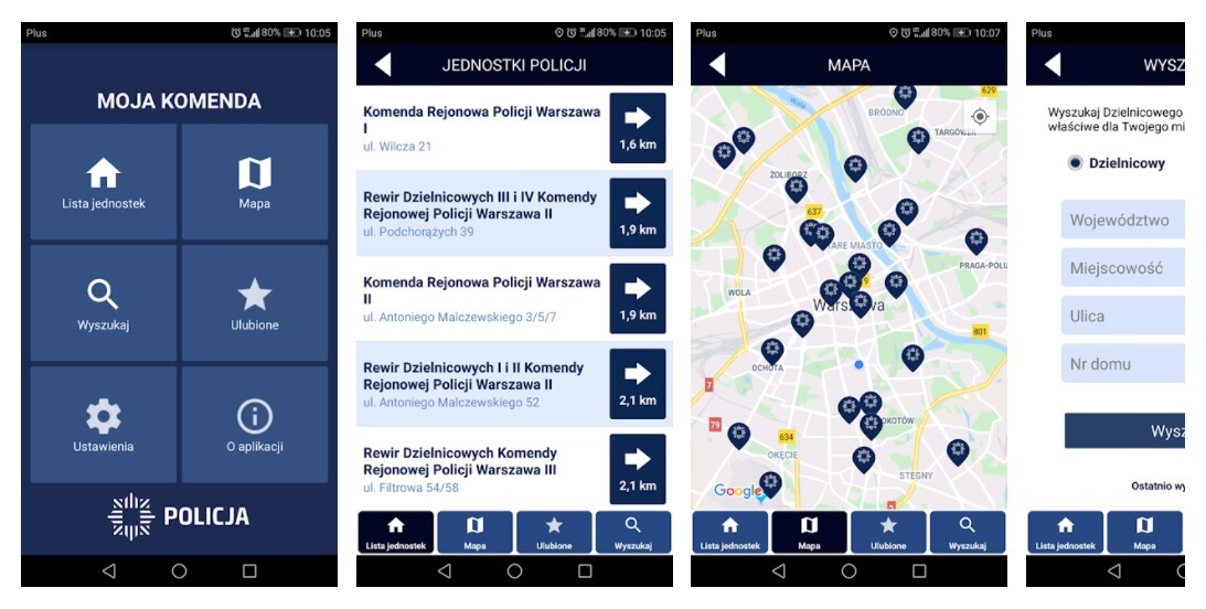 Aplikacja „Moja komenda” zawiera także bazę teleadresową wszystkich komend i komisariatów w Polsce. Dodano do niej dodatkowe jednostki, m.in. rewiry dzielnicowych oraz posterunki. Aplikacja została wyposażona w dwa tryby wyszukiwania informacji. Po włączeniu usług lokalizacyjnych w telefonie sama odnajdzie najbliższe policyjne obiekty. Po przejściu w tryb online wystarczy jedno kliknięcie, by wskazała trasę do najbliższej komendy lub komisariatu. Równie sprawnie połączy nas z dyżurnymi policjantami z wybranej jednostki. Dodatkowo „Moja komenda” umożliwia wyszukanie po nazwie jednostki, ulicy lub kodzie pocztowym.