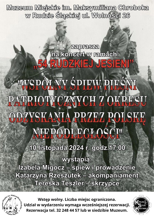 Muzeum Miejskie im. Maksymiliana Chroboka w Rudzie Śląskiej serdecznie zaprasza wszystkich miłośników muzyki i historii na wyjątkowy koncert, który odbędzie się w ramach "54. Rudzkiej Jesieni". Wydarzenie, noszące tytuł "Patriotyczne dźwięki okresu odzyskania przez Polskę niepodległości", jest okazją do przeżycia niezwykłego wieczoru wypełnionego muzyką odzwierciedlającą bogatą historię Polski.