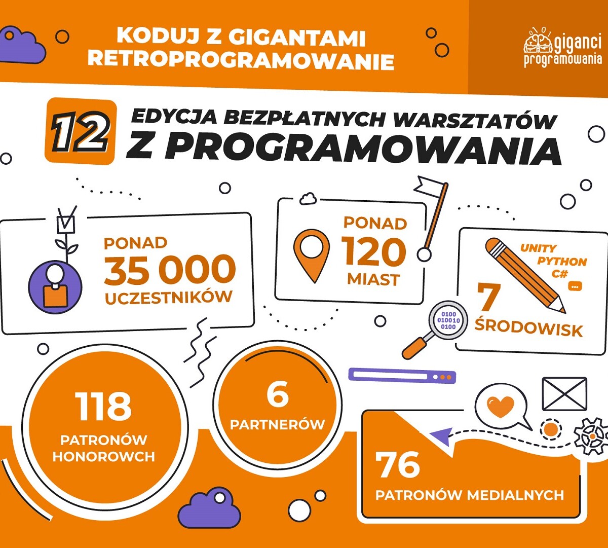 W lutym dzieci i młodzież z całej Polski postawili pierwsze kroki w świecie programowania w ramach największych ogólnopolskich warsztatów programistycznych “Koduj z Gigantami”. W bezpłatnych zajęciach 12. już edycji wydarzenia wzięło udział ponad 35 000 osób. Od 4 lutego do 5 marca uczestnicy warsztatów poznawali podstawy programowania w różnych środowiskach programistycznych. Tym razem motywem przewodnim akcji było “Retroprogramowanie”.