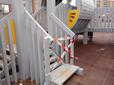 Jak się okazało podczas wchodzenia na jedno z urządzeń pękła stopnica na mocowaniu śrub i dziewczyna wpadła lewą nogą w powstałą wyrwę. Ze względu na silny ból i obrzęk kolana na miejsce wezwano pogotowie ratunkowe. Ratownik medyczny zdecydował o przewiezieniu dziewczyny do szpitala. W wyniku przeprowadzonej kontroli placu zabaw stwierdzono liczne nieprawidłowości, w tym popękane deski, ruchome stopnice czy brak desek w płotku. Do czasu ich usunięcia plac zabaw został zamknięty.