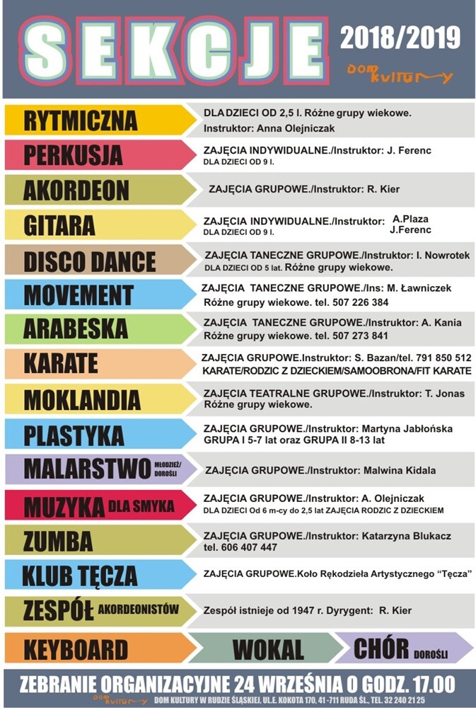 - Tej jesieni zapraszamy dzieci, młodzież, ale także osoby dorosłe do udziału w sekcjach i kołach zainteresowań Domu Kultury w Bielszowicach. Nasza tegoroczna propozycja to wiele zajęć ruchowych (m.in. taniec, balet, rytmika, Zumba fitness, karate, samoobrona, karate rodzic z dzieckiem), a także zajęcia manualne, jak plastyka dla dzieci (2 grupy wiekowe), malarstwo sztalugowe dla młodzieży i dorosłych oraz Klub Rękodzieła Artystycznego „Tęcza” – mówi Anna Magiera z Domu Kultury w Bielszowicach.