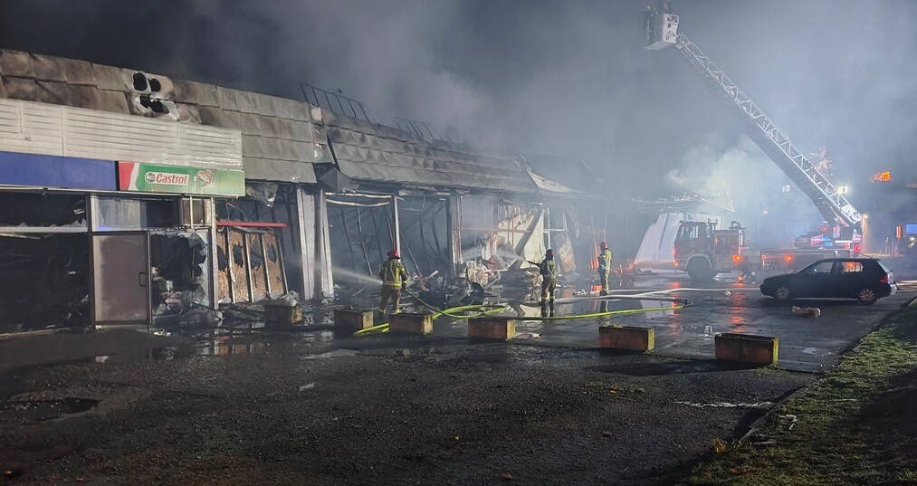 AKTUALIZACJA 26 listopada (9:00): W tej chwili na miejscu pożaru trwa akcja dogaszania, a służby pracują nad oczyszczeniem pogorzeliska. Na miejsce zadysponowano także pracownika Powiatowego Inspektoratu Nadzoru Budowlanego w Rudzie Śląskiej w celu oceny stanu konstrukcji pawilonu handlowego.