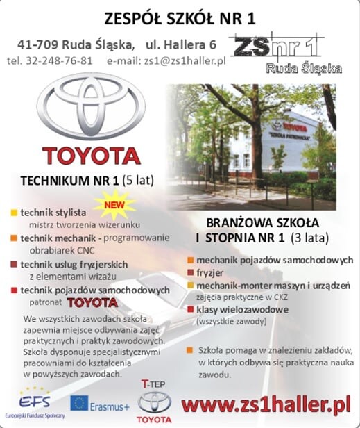 Szkoła współpracuje z wieloma pracodawcami oraz Centrum Kształcenia Praktycznego i Doskonalenia Zawodowego w Rudzie Śląskiej. W ramach kształcenia organizowane są liczne wycieczki przedmiotowe do fabryk, montowni, zakładów pracy w kraju i zagranicą. Technikum nr 1 jest szkołą objętą patronatem Toyoty.