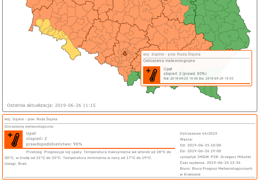 Biuro Prognoz Meteorologicznych ostrzega także przed upałami na obszarze Rudy Śląskiej do godz. 19.00 w dniu 26 czerwca. Temperatura maksymalna w środę wyniesie od 31°C do 33°C. Temperatura minimalna w nocy od 17°C do 19°C.