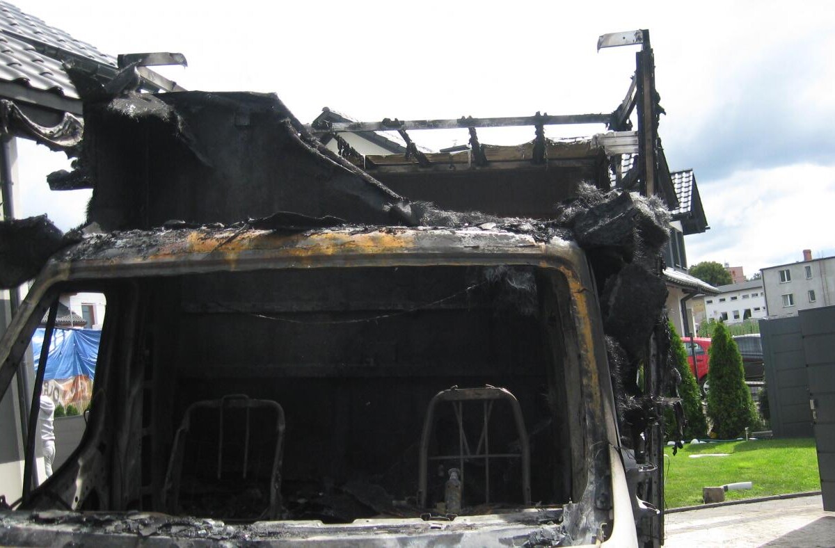 Po dojeździe na miejsce zdarzenia okazało się, że pali się samochód dostawczy oraz dach budynku mieszkalnego w zabudowie bliźniaczej. Strażacy natychmiast przystąpili do gaszenia pożaru. Niezbędna była rozbiórka części pokrycia dachowego budynku. Na skutek pożaru nikt nie ucierpiał. Przczynę pożaru bada Policja.