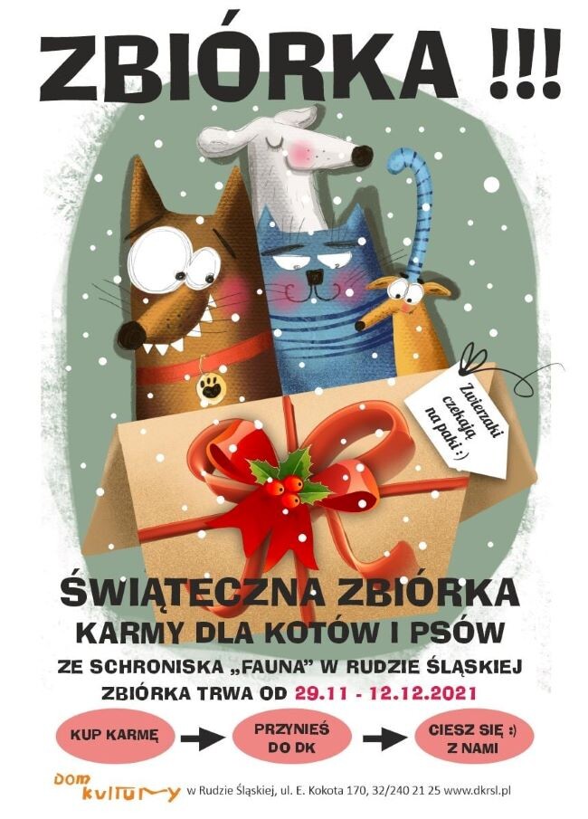 To właśnie zimą bezdomne zwierzaki przebywające w schronisku potrzebują naszej pomocy najbardziej. Jeżeli masz w domu karmę dla psa lub kota, której nie potrzebujesz, możesz zostawić ją w Domu Kultury Bielszowice. Zbiórka trwa do 12 grudnia!