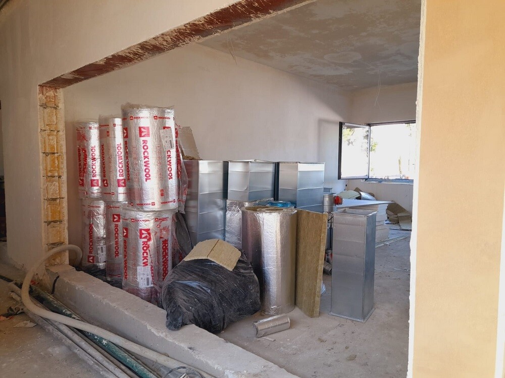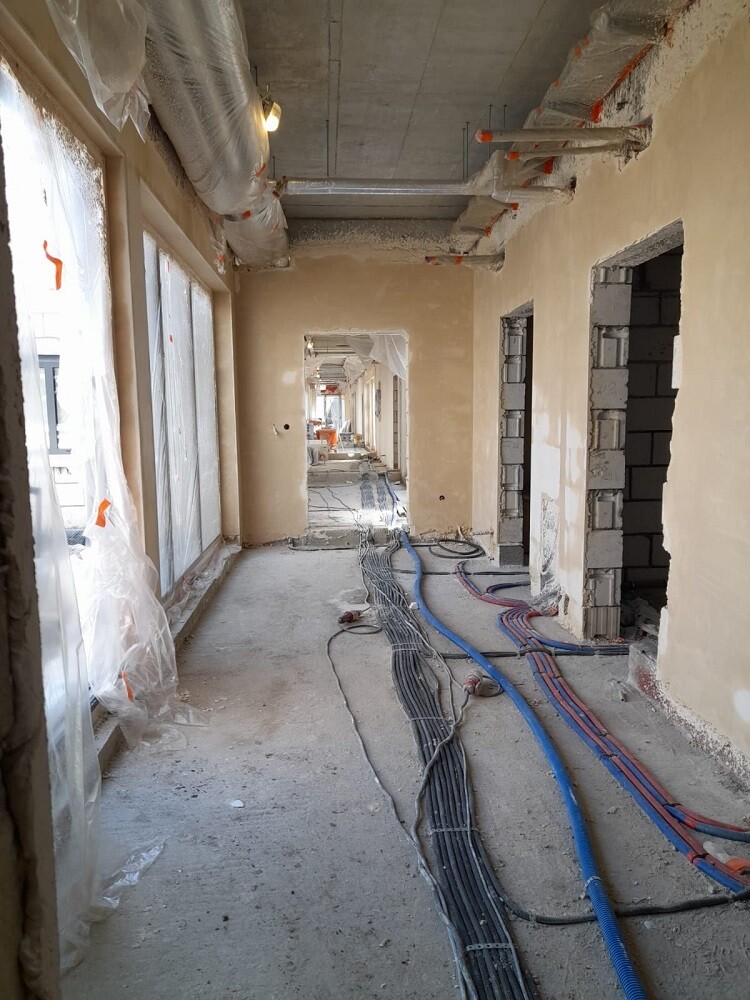 W lutym tego roku w ramach inwestycji zakończono roboty fundamentowe. W kolejnych miesiącach wzniesiono ściany. Segmenty parterowe zostały zakończone i budowlańcy przystąpili do ułożenia konstrukcji drewnianej dachu i jego pokrycia. Równocześnie kontynuowane było układanie kanalizacji oraz całej infrastruktury podziemnej. Zamontowana została także ślusarka aluminiowa (okna, drzwi). W ten sposób ukończony został stan surowy zamknięty, co umożliwiło rozpoczęcie prac wewnątrz budynku. Wiosną br. prowadzone były roboty instalacyjne, sukcesywnie układano tynki na ścianach i sufitach, a na zewnątrz trwały roboty dociepleniowe. Również firma Węglokoks, która jest dostawcą energii cieplnej, wykonywała we własnym zakresie prace związane z doprowadzeniem sieci ciepłowniczej do budynku. Teraz roboty prowadzone są głównie wewnątrz budynków i potrwają jeszcze kilka miesięcy.