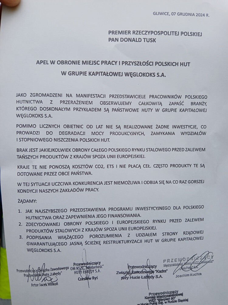 Protestujący złożyli także petycję na ręce minister przemysłu Marzeny Czarneckiej. Dokument dotyczy wstrzymania importu taniej stali z krajów trzecich, co według hutników zagraża krajowemu przemysłowi.