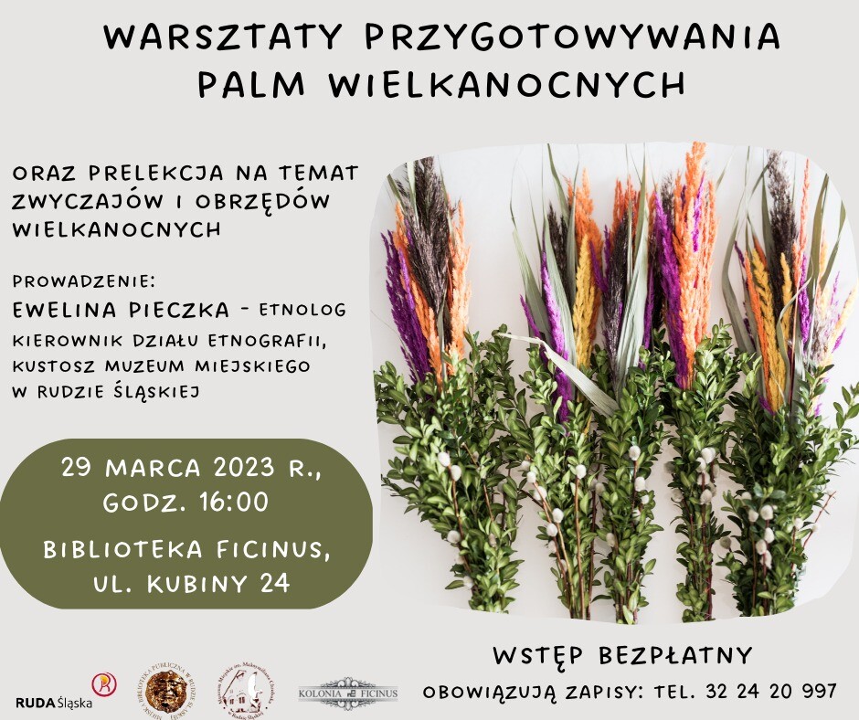 Z kolei w środę, 29 marca br. o godz. 16:00 rozpoczną się warsztaty, na których będzie można własnoręcznie przygotować palmę. Zajęcia poprzedzi krótka prelekcja na temat zwyczajów i obrzędów wielkanocnych. Spotkanie poprowadzi Ewelina Pieczka, etnolog, kierownik działu etnografii, kustosz Muzeum Miejskiego w Rudzie Śląskiej. Warsztaty przeznaczone są dla dzieci w wieku szkolnym i dorosłych. Wstęp jest bezpłatny, jednak ze względu na ograniczoną liczbę miejsc obowiązują zapisy pod nr tel.: 32 24 20 997.