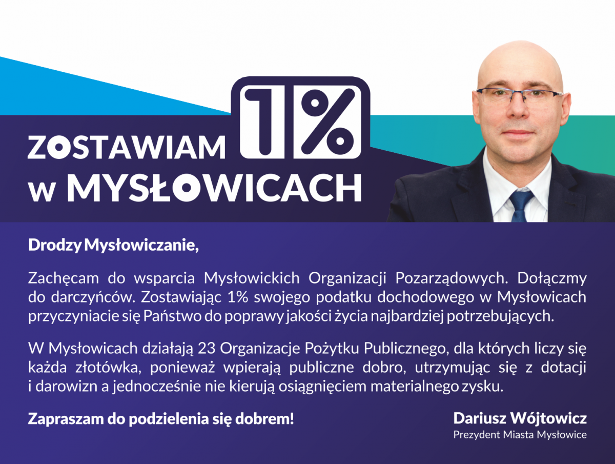Jak co roku Urząd Miasta Mysłowice wspiera organizacje pożytku publicznego działające na terenie miasta .zachęcając mysłowiczan do przekazania swojego 1% podatku właśnie na ich rzecz.