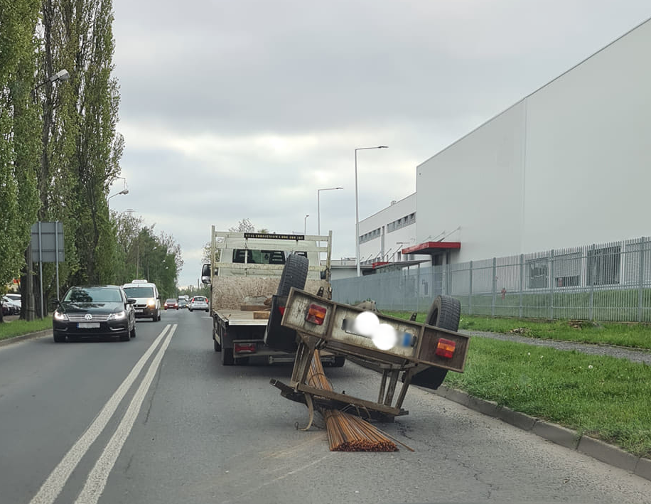 Na miejscu interweniowali policjanci, którzy zostali powiadomieni przez jednego ze świadków zdarzenia o leżącej na drodze przyczepie z drutami i wynikającymi z tego utrudnieniami w ruchu drogowym.