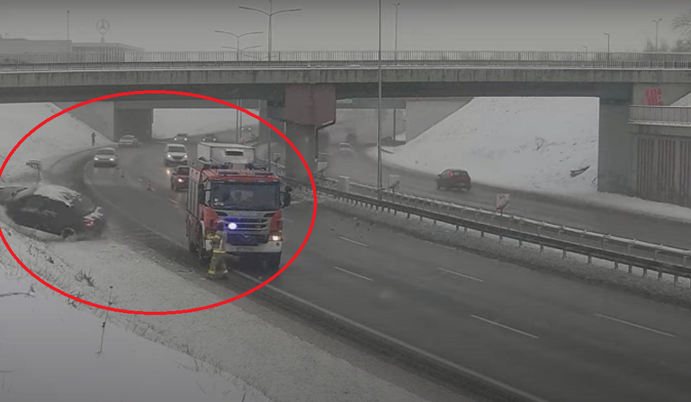 Przed godziną 10, w tym samym miejscu, doszło do drugiego groźnie wyglądającego zdarzenia. Kierowca samochodu marki renault wpadł w poślizg, w wyniku czego samochód uderzył w barierki. Uderzenie było na tyle mocne, że samochód obrócił się i wjechał w skarpę, niemal uderzając w wóz strażacki stojący na prawym pasie. Na szczęście nikomu nic się nie stało.