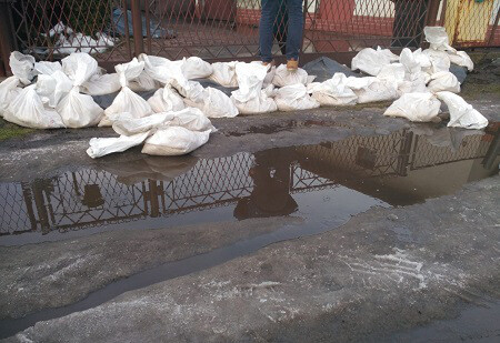 Funkcjonariusze Straży Miejskiej i Straży Pożarnej ułożyli wał z worków z piaskiem oraz zabezpieczyli go materiałem izolacyjnym, co pozwoliło na powstrzymanie napływu wody.