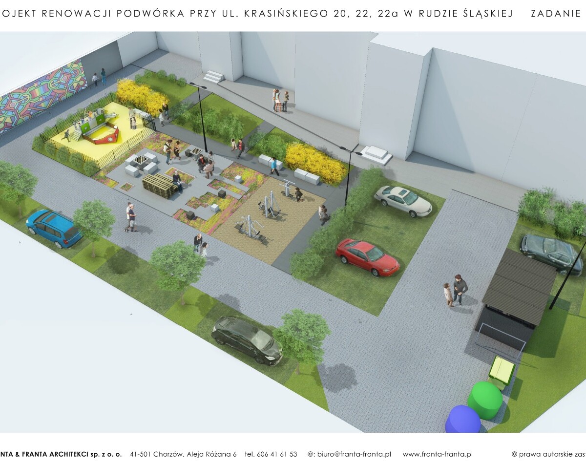 Wytyczona zostanie tu droga dla samochodów i pieszych, powstaną miejsca parkingowe, plac zabaw oraz miejsca odpoczynku dla dzieci, młodzieży i dorosłych. Pojawi się też dużo zieleni, a cały teren zostanie oświetlony. Odnawiana przestrzeń to pierwsze z 10 podwórek, które władze miasta zamierzają zrewitalizować w ciągu najbliższych 3 lat w Rudzie Śląskiej. Inwestycje te realizowane będą z wykorzystaniem środków unijnych.