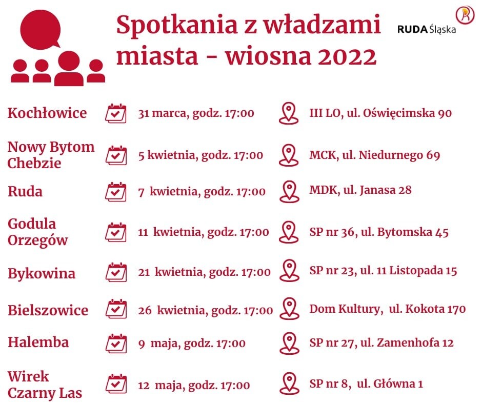 31 marca br. rozpocznie się wiosenna seria spotkań władz Rudy Śląskiej z mieszkańcami w poszczególnych dzielnicach miasta. Będzie to już 20. edycja zebrań dzielnicowych.