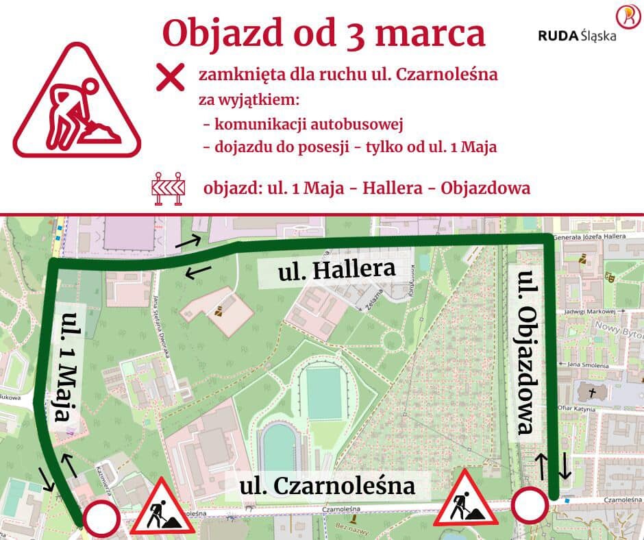 Dojazd do posesji jest możliwy wyłącznie od strony ul. 1 Maja. Natomiast objazd poprowadzony został ulicami 1 Maja, Hallera i Objazdową. Co istotne, na czas remontu został skrócony odcinek ulicy Hallera, na którym obowiązuje ograniczenie dostępności, tak by samochody ciężarowe mogły również korzystać z objazdu. Usunięte zostały również szykany drogowe na ul. Objazdowej.