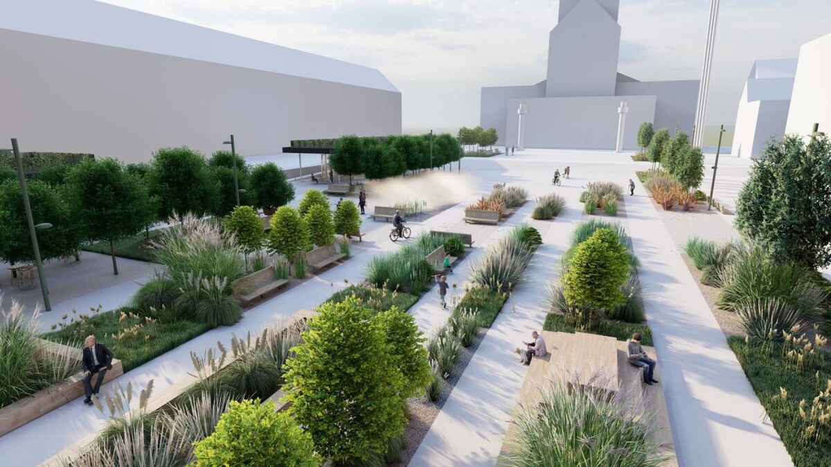 Równolegle do pawilonów przebiegać będzie główny szpaler drzew, z siedziskami i trawnikami pomiędzy nimi. W centralnej części rynku znajdować się będzie plac z okresową retencją wody, gdzie latem czynne będą kurtyny wodne.