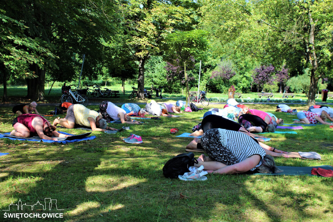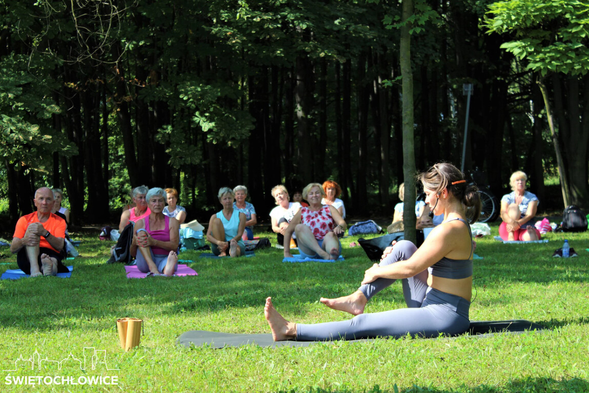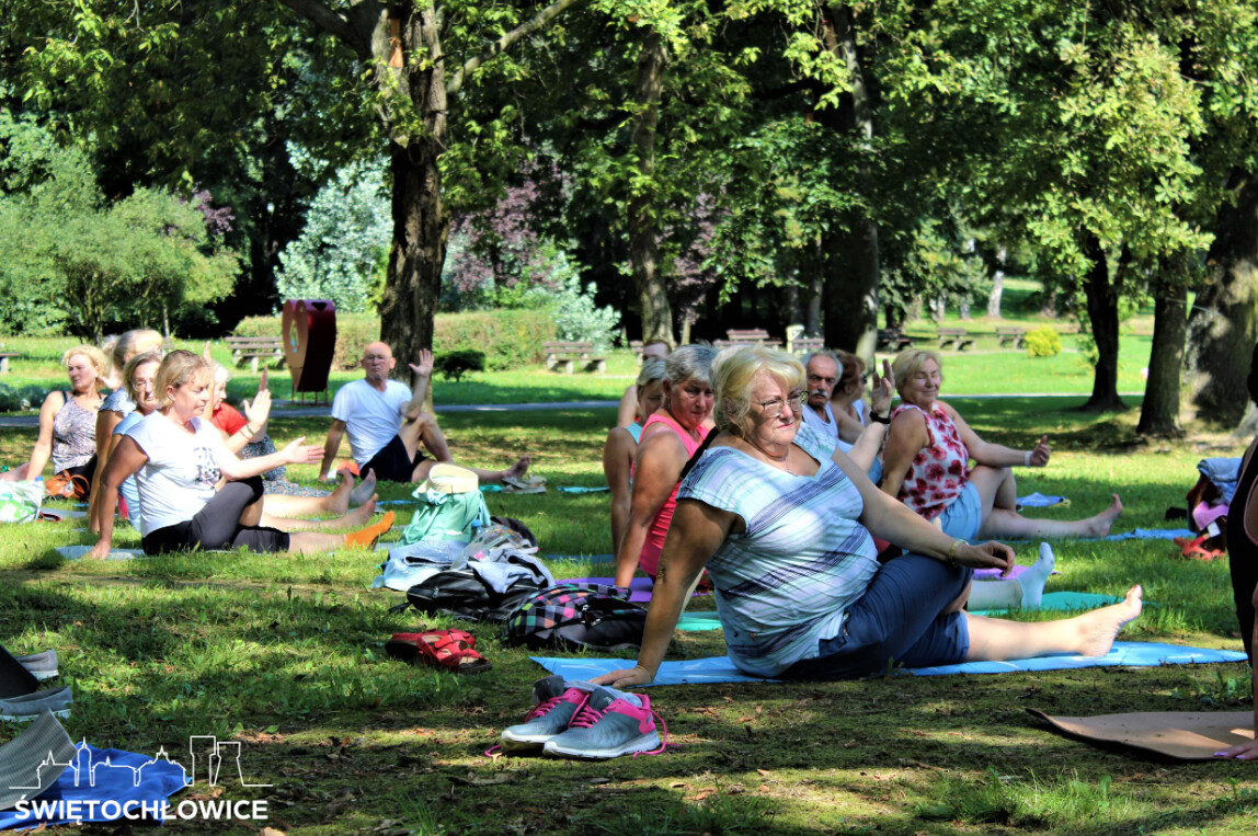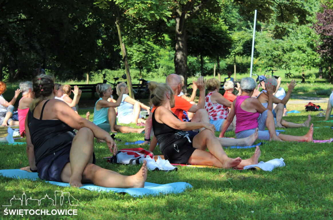Seniorzy, którzy na co dzień uczęszczają na zajęcia z Holi Vitta w Młodzieżowym Domu Kultury w Świętochłowicach oraz w Centrum Integracji Międzypokoleniowej w Chorzowie tym razem spotkali się na wspólnych ćwiczeniach w plenerze.