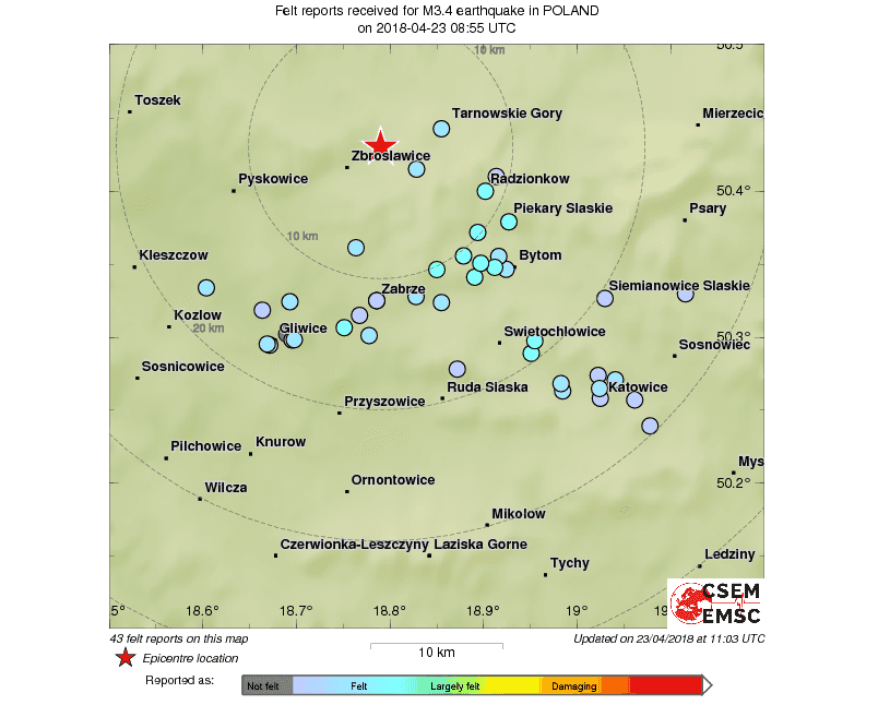 Dzisiaj przed godziną 11:00 doszło do silnego wstrząsu. Najbardziej zatrzęsło w Bytomiu, jednak odczuli go również mieszkańcy innych miast m.in.: Piekar Śląskich, Świętochłowic, Rudy Śląskiej, Katowic i Sosnowca.