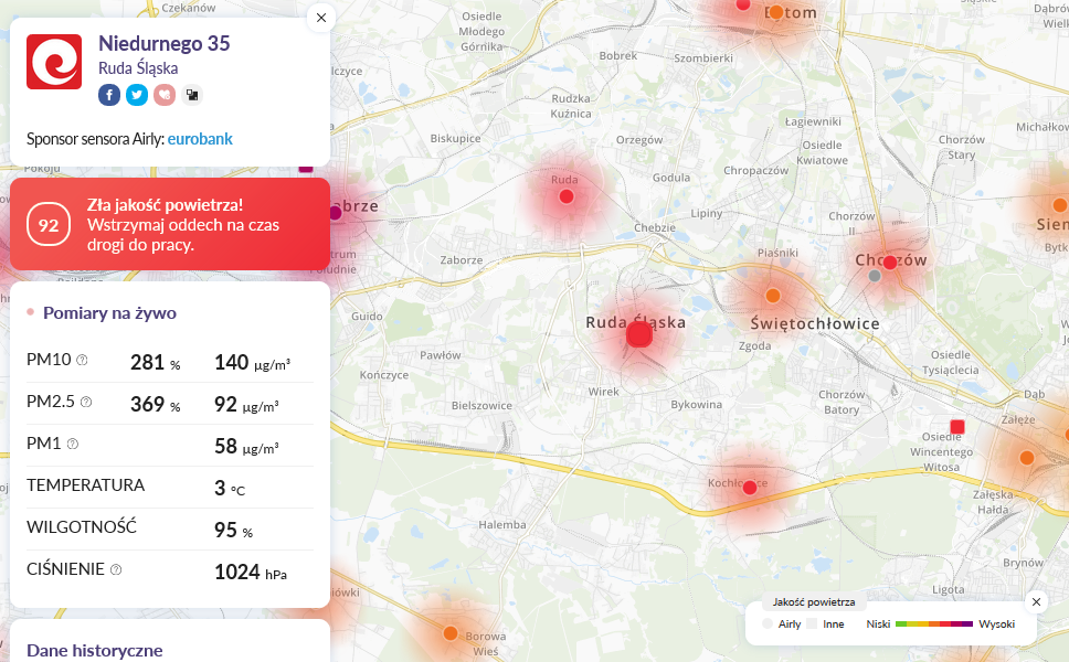- Ruda – budynek MPGM TBS, ul. Janasa - jakość powietrza zła - PM10 296,04 μg/m³, PM2,5 218,10 μg/m³