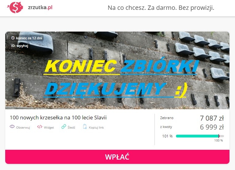 Wspomniana zbiórka zakończyła się w sobotę, 17 sierpnia. Planowano zebrać 6999, ale finalnie na konto trafiło aż 7087 zł. Dzięki temu uda się zakupić sto krzesełek na stulecie istnienia klubu.