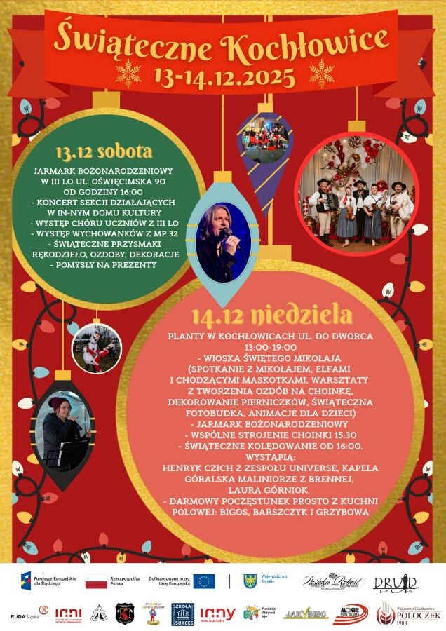 Wydarzenia w ramach „Świątecznych Kochłowic” odbędą się w weekend, 13 i 14 grudnia. W sobotę od 16:00 w III LO im. Jana Pawła II będzie trwał Jarmark Bożonarodzeniowy. Oprócz możliwości kupna rękodzieła, ozdób, dekoracji i świątecznych przysmaków, będzie można również posłuchać koncertu sekcji działających w In-nYm Domu Kultury i obejrzeć występy chóru uczniów z III LO i wychowanków z MP nr 32.