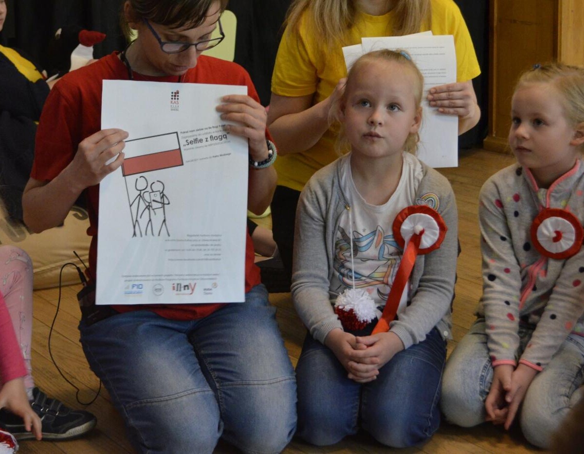 Dzięki wsparciu seniorów każde dziecko wykonało kokardę narodową, kolorowy magnes oraz pomponiki również w biało- czerwonym kolorze. Radość, uśmiech i zadowolenie zagościły na twarzach zarówno uczestniczących dzieci jak i seniorów. Został ogłoszony konkurs fotograficzny "Selfie z flagą". Zdjęcia można przysyłać do 15.05.2019. Zadanie zostało zrealizowane dzięki dotacji Funduszu Inicjatyw Obywatelskich.