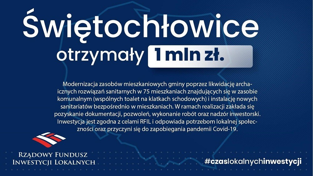 W ramach III naboru Rządowego Funduszu Inwestycji Lokalnych Świętochłowice pozyskały fundusze na modernizację zasobów mieszkaniowych gminy poprzez likwidację archaicznych rozwiązań sanitarnych w 75 mieszkaniach znajdujących się w zasobie komunalnym (wspólnych toalet na klatkach schodowych) i instalację nowych sanitariów bezpośrednio w mieszkaniach.