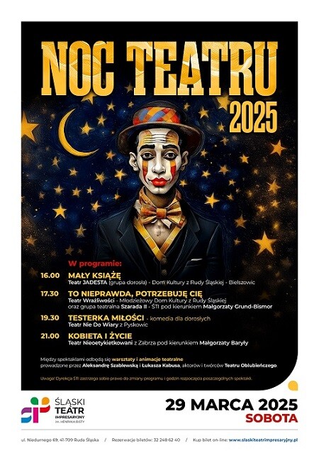 Śląski Teatr Impresaryjny im. Henryka Bisty w Rudzie Śląskiej zaprasza na 9. edycję Nocy Teatru, która odbędzie się 29 marca 2025 roku (sobota) o godz. 16:00. To coroczne wydarzenie jest okazją do świętowania Międzynarodowego Dnia Teatru, przypadającego na 27 marca.