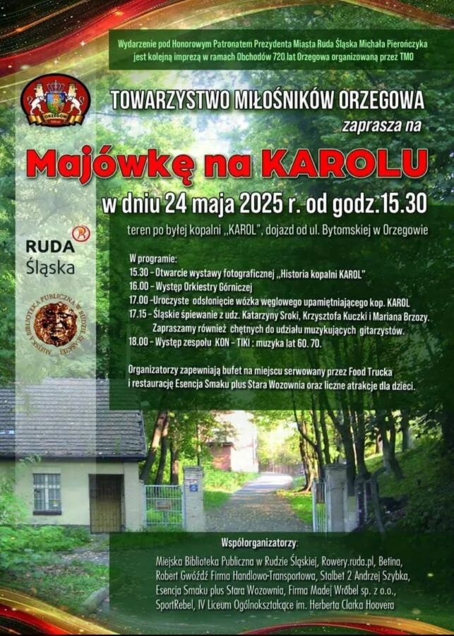 Majówka na Karolu odbędzie się 24 maja o 15:30. Wydarzenie organizuje Towarzystwo Miłośników Orzegowa, we współpracy z Miejską Biblioteką Publiczną, IV LO oraz firmami z naszego miasta. Majówka rozpocznie się od otwarcia wystawy fotograficznej „Historia Kopalni Karol”. Zaplanowano również występ Orkiestry Górniczej oraz zespołu KON-TIKI, a także wspólne, śląskie śpiewanie. Głównym punktem programu jest uroczyste odsłonięcie wózka węglowego upamiętniającego kopalnię Karol.