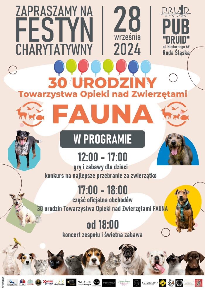 Festyn charytatywny z okazji 30. urodzin TOZ „Fauna” odbędzie się w sobotę, 28 września w pubie Druid. Zaplanowano gry i zabawy dla dzieci, konkurs na najlepsze przebranie za zwierzątko, a także koncert. W ramach wydarzenia prowadzona będzie zbiórka funduszy oraz licytacja voucherów od sponsorów imprezy. Zebrane środki zostaną przekazane na leczenie podopiecznych schroniska.