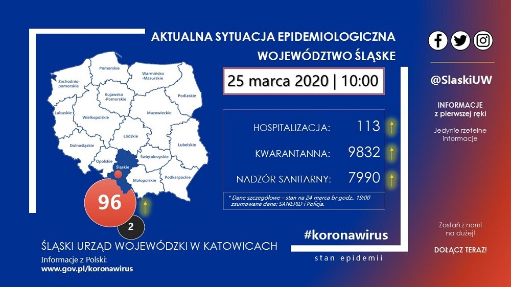 U 9 kolejnych osób w woj. śląskim potwierdzono w ostatnich godzinach zakażenie koronawirusem – podał w środę Śląski Urząd Wojewódzki w Katowicach. W sumie w regionie jest 96 zakażonych.