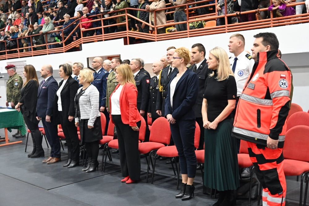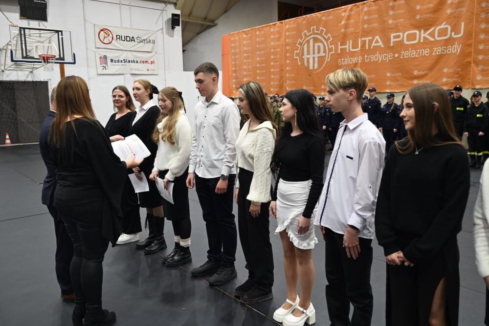 Uroczyste ślubowanie klas pierwszych o profilu wojskowym, policyjnym i ratownictwa medycznego odbyło się na hali MOSiR w Nowym Bytomiu. W sumie przysięgę złożyło 55 uczniów. Podczas uroczystości nadano również wyższe stopnie kadetom starszych klas mundurowych i przyznano wyróżnienia uczniom klas ogólnych. Wskazano także nowego Dowódcę Szkoły oraz jego zastępcę. Uczniów wspierali ich najbliżsi zasiadający na trybunach.