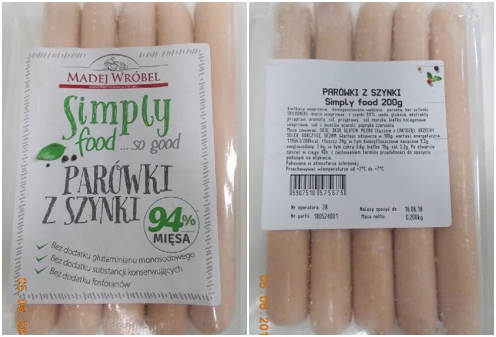 - Produkt – dane na etykiecie: Parówki z Szynki. Simply food 200g