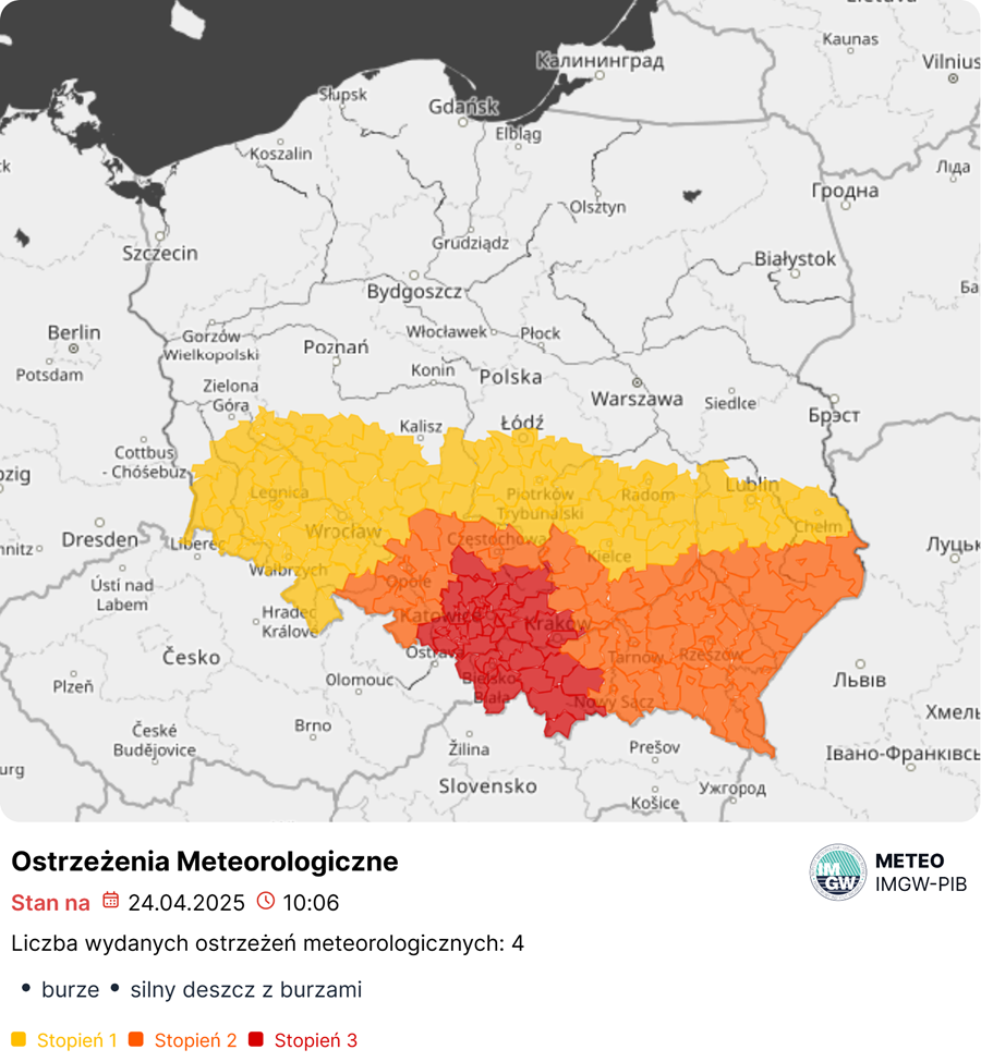 Instytut Meteorologii i Gospodarki Wodnej (IMGW) wydał najwyższy, 3. stopnia alert pogodowy dla województwa śląskiego, w tym dla miasta Ruda Śląska. Ostrzeżenie obowiązuje od godziny 13:00 w czwartek (24.04.2025) do godziny 01:00 w nocy z czwartku na piątek (25.04.2025). Mieszkańcy regionu muszą przygotować się na gwałtowne i potencjalnie niebezpieczne zjawiska pogodowe.