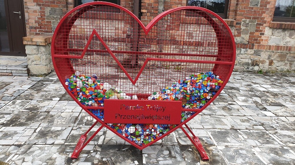 Kolejne wielkie serce na nakrętki stanęło w Kochłowicach. Czerwony pojemnik w kształcie serca stanął w tym tygodniu na placu kościelnym pomiędzy domem parafialnym a probostwem parafii pw. Trójcy Przenajświętszej.