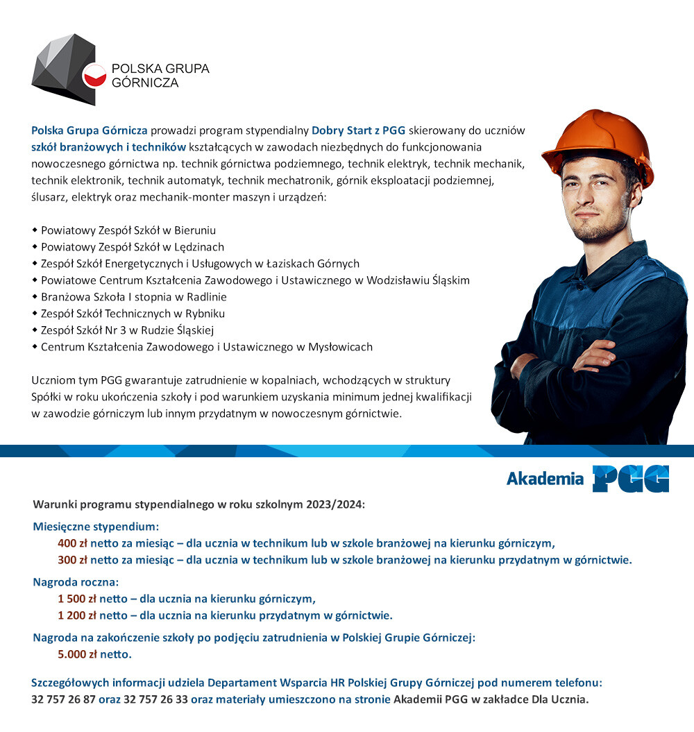 W ramach współpracy i realizacji programu "Dobry Start z PGG" w Zespole Szkół nr 3 w Rudzie Śląskiej zostanie przeprowadzony nabór uczniów na rok szkolny 2023/2024 do technikum do klasy, w której będzie prowadzone kształcenie na kierunku technik górnictwa podziemnego oraz do branżowej szkoły I stopnia do klasy przygotowującej do wykonywania zawodu ślusarza i elektryka.